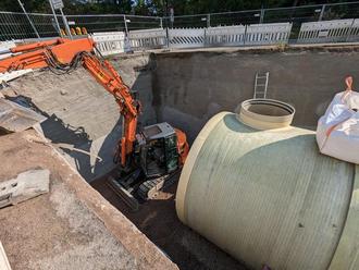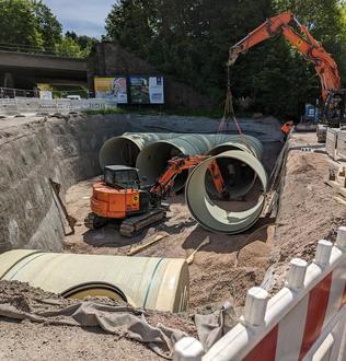 Der neue Stauraumkanal ermöglicht es, 390 Kubikmeter Wasser bei Starkregen aufzufangen und langsam und dosiert ins Kanalnetz abzugeben“, erläutert André Jäger. Für den Einbau der GFK-Rohre, die aus glasfasterverstärktem Kunststoff bestehen und einen Durchmesser von mehr als drei Metern haben, war auch eine Vollsperrung der Bahnhofstraße in Erwägung gezogen worden.
