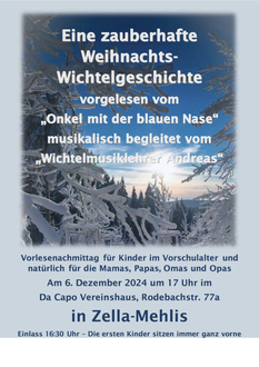 Einer Idee von jungen Großvätern des Musikvereins Da Capo folgend, ist es tatsächlich Tradition geworden, im Advent für die Kinder einen Vorlesenachmittag zu gestalten. Der Musikverein Da Capo schmückt seine Räume weihnachtlich und wer weiß, was da noch so alles passiert. Wie immer werden ganz viele Lammfelle für die Kinder ausgelegt, auf denen sie Platz nehmen und dem Märchen lauschen können. Für die Mamas, Papas oder Omas und Opas haben wir natürlich auch genügend Platz.