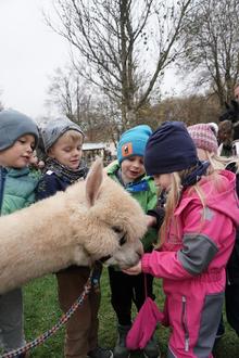 Höhepunkt war dann jedoch die Überraschung am Freitag: Echte Tiere waren im Kindergarten zu Besuch und zwar zwei Alpakas und zwei Lamas „Vom roten Berg“ aus Unterwellenborn sowie zwei Ponys vom „Gnadenhof Themar“. Das war fantastisch! Die Kinder haben viel über die Tiere gelernt. Sie durften sie streicheln, striegeln und sogar füttern. Für einige Kinder war das schon eine kleine Mutprobe - aber alle haben diese Begegnung ganz besonders in Erinnerung behalten.