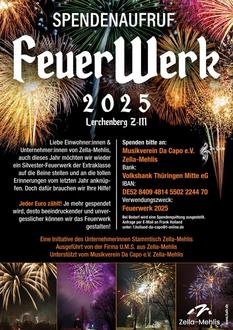 Damit das Feuerwerk zum Abschied des alten und zur Begrüßung des neuen Jahres wieder ein Höhepunkt wird, wurde einen Spendenaufruf an alle Unternehmer sowie die Zella-Mehliser Bürger gestartet, um Unterstützer für das Silvesterfeuerwerk zu gewinnen. Denn: "Jeder Euro zählt. Je mehr gespendet wird, desto beeindruckender und unvergesslicher können wir das Feuerwerk gestalten", der gemeinsame Aufruf.