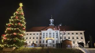 Eine 14 Meter hohe Nordmanntanne steht in diesem Jahr als Weihnachtsbaum vor dem Rathaus. Die Mitarbeiter des Fachdienstes Stadtservice haben ihn gemeinsam mit der Firma Schelhorn in der Heinrich-Ehrhardt-Straße gefällt, transportiert und auf dem Platz vorm Rathaus aufgestellt. Anschließend wurde der Baum geschmückt.