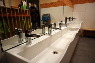 Drei Mal am Tag werden die älteren Gruppen mit ihren Erzieherinnen hierher kommen und frühstücken, Mittag essen und vespern. „Es ist klasse, dass wir dann nicht mehr in den Gruppenräumen essen. Wir stellen uns das eher als Restaurant denn als Kantine vor, denn wir wollen wirklich in einer ruhigen, gemütlichen Atmosphäre mit den Kindern essen. Tischgespräche und Tischmanieren sind uns dabei wichtig - aber eben auch die Selbstständigkeit: Möchte das Kind Käse oder Wurst aufs Brot, wie viel möchte es sich von den einzelnen Komponenten des Mittagessens auf den Teller nehmen, hat es zum Vesper eher Appetit auf Obst oder auf Kuchen? Dass wir den Essensversorger direkt mit im Haus haben, dazu je eine Strecke zum Warm- und Kalthalten der Mahlzeiten, das ist dabei optimal“, führt sie aus.