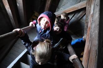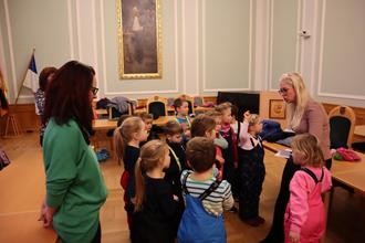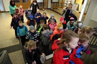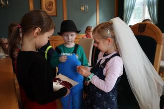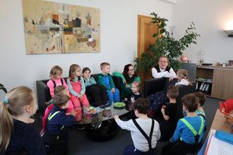 Am wichtigsten war ihnen, dass alles schön ordentlich bleibt und keine Häuser angesprüht werden. Wohl eine einmalige Gelegenheit war die Besichtigung des Glockenturms. Im Standesamt wurde von einer Kinder-Standesbeamtin ein Kinder-Pärchen getraut - einschließlich Kuss und Ringe! Voller Eindrücke kamen die Jungen und Mädchen schließlich ins Büro des Bürgermeisters, wo sie ihm ihre Fragen stellten: Wie wird man Bürgermeister? Wer arbeitet hier noch alles? Wie viele Tiere gibt es in der Stadt? Warum habt ihr euch dieses Wappen ausgesucht?