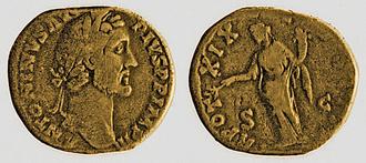 Auch die Münze selbst hält einige Informationen bereit. Auf der Vorderseite ist Antoninus Pius (86 bis 161 n. Chr.) abgebildet, der von 138 bis zu seinem Tod römischer Kaiser war. Unter ihm erlebte das Römische Reich seine letzte längere Friedensperiode. Dazu passt das Bild der Göttin Pax auf der Rückseite, die mit Füllhorn und Olivenzweig als Symbol des Friedens dargestellt ist. Die göttliche Verkörperung des Friedens erfreute sich nach langen unruhigen Zeiten großer Beliebtheit. Der Wortstamm „pactum“ weist darauf hin, dass Pax im römischen Verständnis nicht nur Frieden, sondern dieser immer auch das Ergebnis eines Vertrages (Paktes) bedeutete.