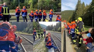 Höhepunkte waren auch die Ausbildung an der Drehleiter und das Aufgleistraining mit dem Hilfeleistungsgruppenlöschfahrzeug, das auch auf Schienen fahren kann und für den Einsatz im Brandleittunnel genutzt werden kann. Alle Mitglieder der Jugendfeuerwehr von beiden Standorten durften einmal auf dem Fahrzeug auf Schienen mitfahren!