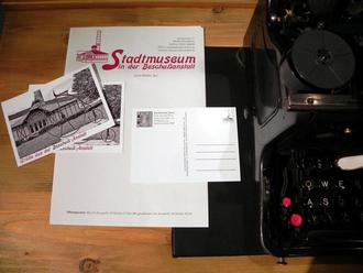 Da das Schreiben auf Schreibmaschinen mittlerweile ebenfalls längst der Vergangenheit angehört und die jüngeren Generationen meist nicht mehr viel oder gar nichts damit anfangen können, haben wir uns entschieden, ein Exemplar aus unserer Sammlung von mechanischen Mercedes-Schreibmaschinen als Probierobjekt zur Verfügung zu stellen. Von jetzt an kann man also selbst in die Tasten hauen und sich auf extra hierfür von uns gestaltetem Briefpapier sogar seinen persönlichen schreibmaschinen-geschriebenen Brief mit nach Hause nehmen. Auch eigens zum Beschreiben mit der Schreibmaschine entworfene Postkarten mit der Frontansicht des Stadtmuseums in der Beschußanstalt stehen unseren Besuchern ab sofort zur Verfügung. Die Postkarten können sogar postalisch versandt werden - das ist doch mal ein ganz persönlicher Urlaubsgruß aus Zella-Mehlis! (jk)