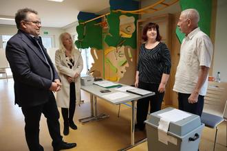 Dankeschön am Wahlsonntag: Bürgermeister Torsten Widder und Wahlbeauftragte Nadine Wirth im Gespräch mit den Wahlhelfern Carmen Fischer und Wilfried Ertel (von links).