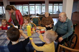 „Wir haben die Runde bewusst klein gehalten, so ist die Atmosphäre ganz familiär. Für die Kinder ist es ja auch erstmal fremd und aufregend, so können sie Vertrauen fassen. Wir merken ganz deutlich, wie belebend das für unsere Bewohner ist. Auch Menschen, die sonst sehr in sich gekehrt sind, reden auf einmal ganz anders“, freut sich Stefanie Kerkow über das gute Gelingen dieses ersten Schrittes.