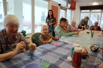 „Wir möchten das deutlich erweitern und haben schon viele Ideen dazu“, erklärt DRK-Sozialtherapie-Leiterin Stefanie Kerkow. Zunächst haben die Dreijährigen (die Gruppe „Lila“ aus dem Kindergarten) gemeinsam mit den älteren Damen und Herren vom Wohnbereich 1 und 2 Ostereier bemalt.