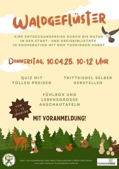 Kommt mit auf eine spannende Entdeckungsreise in die Natur. Am 10. April erwartet euch in unserer Bibliothek ein aufregendes Abenteuer in Kooperation mit Thüringen Forst. Für Kinder zwischen sieben und zwölf Jahren gibt es ein Quiz mit tollen Preisen, eine Fühlbox und lebensgroße Anschautafeln, die den Wald zum Leben erwecken.