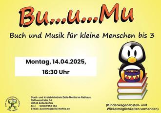 Entdecken, Staunen, Mitsingen - bei Bu…u…Mu tauchen schon die Jüngsten in die wunderbare Welt der Bücher und Musik ein! Kinder bis drei Jahre sind gemeinsam mit ihren Begleitpersonen eingeladen, Geschichten, Lieder und Fingerspiele zu erleben. Nach einem fröhlichen Begrüßungslied gibt es spannende Bilderbücher zu bestaunen und verschiedene Musikinstrumente auszuprobieren.