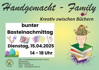 Handgemacht Family XXL: Du hast Lust deinen eigenen Stiftebecher zu gestalten, eine Lesezeichen zu basteln oder eine deiner eigenen Ideen zu verwirklichen? Dann komm am 15. April in die Bibliothek zu "Handgemacht Family XXL". An Material haben wir fast alles da und du bist herzlich eingeladen, deiner Kreativität freien Lauf zu lassen. Da der Termin in die Osterferien fällt sind wir bereits ab 14 Uhr für euch da.