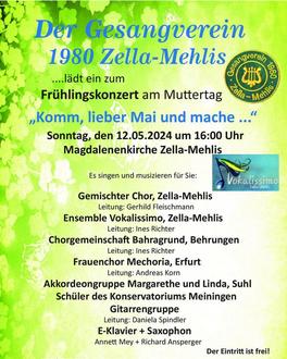 In diesem Jahr möchten wir Sie wieder zu unserem Frühlingskonzert am Muttertag, Sonntag, den 12. Mai, 16 Uhr in die Magdalenenkirche Zella-Mehlis einladen.