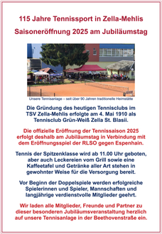 Die Tennisanlage des TV Zella-Mehlis ist seit mehr als 90 Jahren traditionelle Heimstätte. Die Gründung des heutigen Tennisclubs im TSV Zella-Mehlis erfolgte am 4. Mai 1910 als Tennisclub Grün-Weiß Zella St. Blasii. Die offizielle Eröffnung der Tennissaison 2025 erfolgt deshalb am Jubiläumstag in Verbindung mit dem Eröffnungsspiel der RLSO gegen Espenhain.