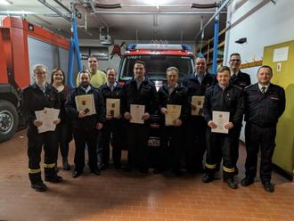 Auf dem Bild von links nach rechts: Marie Herold, Ortsbeigeordnete Sophia Mohring, Johannes Ziemerle, 3. VG-Beigeordneter Bernd Hofer, Philipp Ziemerle, Timmy Sauter, Dieter Ziemerle, Christoph Wick, Niklas Hofer, Wehrleiter Martin Amann, stv. Wehrleiter Andreas Schumacher.