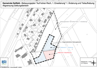 Der Ortsgemeinderat Dellfeld hat gemäß § 2 Abs. 1 BauGB in Verbindung mit § 13a BauGB in der Sitzung am 12.05.2025 die Änderung und Teilaufhebung des Bebauungsplanes „Auf hohen Rech, 1. Erweiterung“ beschlossen (Änderungs-aufstellungsbeschluss). Die Aufstellung erfolgt gemäß § 13a i. V. m. §13 BauGB im vereinfachten Verfahren. Gemäß § 13 BauGB wird von der Umweltprüfung nach § 2 Abs. 4 BauGB, von dem Umweltbericht gemäß § 2a BauGB, von der Angabe nach § 3 Abs. 2 Satz 2 BauGB, welche Arten umweltbezogener Informationen verfügbar sind, sowie von der zusammenfassenden Erklärung nach § 10 a BauGB abgesehen.