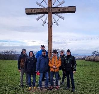 Traditionell findet zwischen den Feiertagen von Weihnachten und Neujahr die Jahresabschlusswanderung des TTC Bann statt. So traf man sich morgens am 29.12.22 in der Tennisalm, um dann eine schöne Halbtages-Wanderung durchzuführen. Unter Führung des 1.Vorsitzenden, Franz Gros, ging es trotz leichten Nieselregens zunächst die Ziegelsteige hoch über den Kahlenberg hinunter zum Forsthaus „Kahlenberg“. Von dort lief die Wandergruppe am oberen Bärenloch vorbei hinüber zum Steigerhof. Dann stieg man den schmalen Wanderpfad wieder hinauf zum Hausberg, wo man an dem neuen Gipfelkreuz Rast machte. Obwohl auf der Sickinger Hochfläche der Wind pfiff, waren alle bei Schnaps und Flaschenbier guter Laune. Schnell marschierte die Truppe hinunter nach Bann, wo man im Gasthaus „Bäckers“ beim zünftigen Steakessen noch gemütlich beisammen saß. (ge)