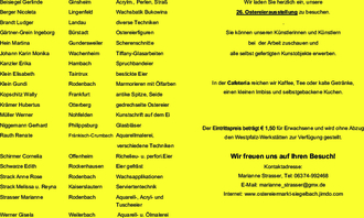 20 Aussteller stellen ihre selbstgefertigten Kunstwerke auf großen und kleinen Kalkschalen, Glas und Ton aus. Lassen Sie sich inspirieren und bewundern Sie die einzigartigen Schmuckstücke. Sie können die Kunst am Ei bestaunen, erwerben oder selbst Ostereier gestalten. Dazu sind besonders Kinder herzlich eingeladen.