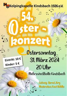 Genießen Sie das 54. Osterkonzert der Kolpingkapelle Kindsbach am Ostersonntag, den 31. März 2024, um 20 Uhr. Tauchen Sie ein in eine festliche Atmosphäre voller musikalischer Freude unter der Leitung von Bernd Jörg und die Moderation übernimmt Knut Böhlke.