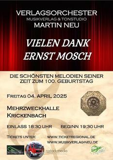 Tauchen Sie ein in die Welt der böhmischen Blasmusik und erleben Sie einen unvergesslichen Konzertabend zu Ehren von Ernst Mosch, dem wohl bekanntesten und einflussreichsten Vertreter dieses Genres. Anlässlich seines 100. Geburtstags laden die Freunde der Feuerwehr Krickenbach gemeinsam mit dem Verlagsorchester Martin Neu und den Gesangssolisten Rita und Martin zu einem musikalischen Fest voller Emotionen, Erinnerungen und unvergesslicher Melodien ein.