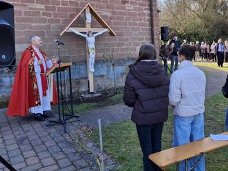Das 140 Jahre alte Kirchenkreuz vor der Valentinuskirche in Bann wurde am vergangenen Sonntag im Rahmen einer würdigen Feierstunde von Pfarrer Stenz eingesegnet. Das Kruzifix mit dem 1,50 m großen Corpus Christi war im vergangenen Jahr Opfer eines satanistischen Anschlags geworden und schwer geschändet und beschädigt worden, was in der Bevölkerung von Bann mit Entsetzen als ein Anschlag auf alle empfunden wurde. Die Bännjer Metallbaufirma Epp schweißte wieder die gusseiserne Christusfigur und die Zimmerei Künstler schreinerte ein neues Holzkreuz. Die Malerarbeiten übernahm der ortsansässige Künstler, Alexander Traub. Viele Gläubige waren am Sonntagmorgen gekommen, um der ergreifenden Einweihung beizuwohnen, die von den Westpfälzer Musikanten musikalisch umrahmt wurde. In seiner Begrüßungsrede lobte Gemeindeausschussmitglied Bernhard Keller den Zusammenhalt in der Gemeinde und bedankte sich bei allen an der Restauration beteiligten Firmen und Helfern. Altbürgermeister Arnold Germann gab einen kurzen historischen Abriss über die religiösen Hintergründe dieses Kreuzes, das von dem damaligen Pfr. Adolf Graf im Rahmen einer Volksmission im Jahre 1886 angeschafft wurde. Das Kreuz hing ursprünglich an einer Säule im Innern der Kirche, bis es nach dem II. Vatikanischen Konzil abgehängt und dann auf Beschluss des Pfarrgemeinderates an der Nordseite der Valentinuskirche aufgestellt wurde. Auch der 1. Kreisbeigeordnete, Jan Schneider, und der Ortsbeigeordnete, Richard Roschel, lobten in ihren Reden die gute Zusammenarbeit der politischen und kirchlichen Gemeinde und dankten allen Helfern für das gelungene Werk. Nach der offiziellen Feier gab es bei strahlendem Sonnenschein für alle einen Sektempfang. (ge)