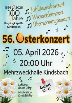 Anlässlich unseres Jubiläumsjahres erwartet die Besucherinnen und Besucher beim diesjährigen 56. Osterkonzert ein ganz besonderes Programm. Das Konzert findet am 05.04.2026 um 20:00 Uhr in der Mehrzweckhalle in Kindsbach statt und verspricht einen abwechslungsreichen und spannenden musikalischen Abend.