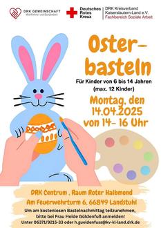 Alle Kinder von 6 bis 14 Jahren sind ganz herzlich eingeladen, am Montag, den 14.04.2025, von 14:00 bis 16:00 Uhr beim Osterbasteln mitzumachen! Wir basteln zusammen coole Sachen für Ostern. Wo? Im DRK Centrum Landstuhl, Erdgeschoss, Raum „Roter Halbmond“, Am Feuerwehrturm 6, 66849 Landstuhl. Wenn du mitmachen möchtest, melde dich bitte bei Frau Güldenfuß an. Du kannst sie anrufen unter 06371 921533 oder eine E-Mail an h.gueldenfuss@kv-kl-land.drk.de schicken. Wir freuen uns auf dich!