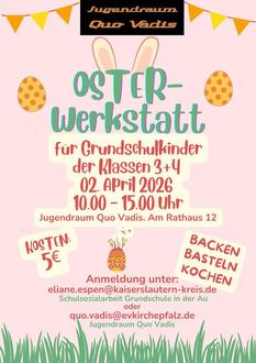 Kreativ werden, gemeinsam kochen und die Osterzeit entdecken - dazu lädt der Jugendraum Quo Vadis auch in diesem Jahr wieder herzlich ein. In Kooperation mit der Schulsozialarbeit der Landstuhler Grundschulen erwartet Kinder ab der 3. Klassenstufe ein abwechslungsreicher Ferientag.