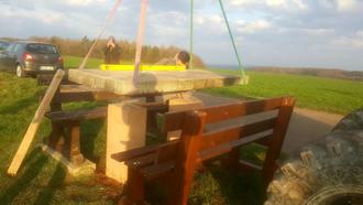 Pünktlich zu Ostern haben die Bännjer Enzian- und Heimatfreunde das idyllische Plätzchen am Gipfelkreuz auf dem Hausberg mit einer weiteren Attraktion aufgewertet. Unter der Fachkompetenz der heimischen Bauunternehmung Wolf GmbH konnte die Bankgruppe nun mit einem massiven Steintisch komplettiert werden und lädt zum herrlichen Panoramablick über die Sickingerhöhe und des Westrichs ein. So gilt der Dank dem Firmeninhaber Karsten Wolf, welcher selbst ein Kamerad und Idealist des Freundeskreises ist. Ein herzliches Dankeschön auch der Picard Natursteinwerk GmbH aus dem Schweinstal für die kostenlose Bereitstellung der beiden Sandsteinsäulen. Ebenso Danke der Gemeinde Bann in Vertretung des Ortsbürgermeisters Stephan Mees für die neue Gemeindefahne, die nun hoch über den Dächern von Bann das Bännjer Hoheitsgebiet signalisiert. Genau durch solche kurzen und vor allem unkomplizierten Wege funktioniert eine gute ehrenamtliche Zusammenarbeit und Nachbarschaftshilfe zum Wohle der Allgemeinheit. Wenn die Wetterverhältnisse besser werden und die rauen Winde auf dem höchsten Berg der Sickingerhöhe nachlassen, werden die Kameraden der Enzian- und Heimatfreunde am Gipfelkreuz einen umfangreichen Frühjahrsputz und einige Renovierungsarbeiten starten. (ro)