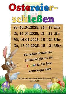 Die Schützengemeinschaft Landstuhl veranstaltet dieses Jahr wieder das Ostereierschießen im Schützenhaus im Fleischackerloch. Hierbei wird nicht, wie häufig angenommen, auf Eier geschossen, sondern auf Schießscheiben. Bei den entsprechenden Treffern ist das gekochte und gefärbte Osterei die Belohnung. Der Verein bietet traditionell beim Ostereischießen das Luftdruckschießen mit Gewehr an. Auf eine Schießscheibe werden drei sichtbare Treffer abgegeben. Für jeden Treffer ins Schwarze gibt es ein buntes Osterei, für jede „Zehn“ sogar zwei. Gewehre und Munition werden zur Verfügung gestellt, für das leibliche Wohl ist bestens gesorgt.