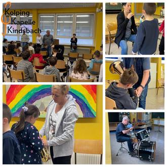 Die Kolpingkapelle Kindsbach war zu Gast in der Heidenfels-Grundschule Kindsbach, um den Kindern die Instrumente eines traditionellen Blasorchesters vorzustellen. Dabei hatten die Kinder die Möglichkeit, jedes Instrument selbst auszuprobieren und anzuspielen.