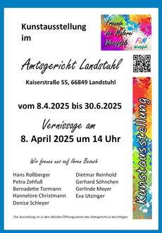 Die „Freunde der Malerei-Westpfalz“ präsentieren sich im Monat April gleich zweimal in Landstuhl: zum einen im Amtsgericht (08.04.2025, 14:00 Uhr), zum anderen im Rathaus (10.04.2025, 17:30 Uhr).