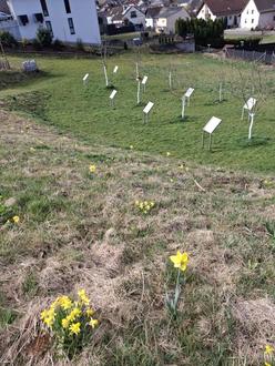 Nach der Erschließung des Baugebietes „Borstenwieschen“ wurde am Abhang zur Waldstraße hin als Ausgleichsfläche von der Gemeinde Bann eine sog. „Storchenwiese“ angelegt. Das heißt, jedes Jahr wird ein Bäumchen gepflanzt und mit einem Namenschild alle Neugeborenen eines Jahres versehen, so dass jeder Jahrgang seinen eigenen Baum hat, der dann wie die Kinder hochwächst und Früchte trägt. Damit die gesamte Kinderwiese in einem gepflegten Zustand bleibt, haben Karl Schmitt und Stephan Blab die Patenschaft übernommen. Jetzt im Frühjahr haben diese Beiden am Abhang Osterglocken gepflanzt, die nunmehr schön erblüht sind. Wenn dann noch die „Kinderbäumchen“ blühen, ergibt sich ein schönes Bild, das zu einem Spaziergang einlädt.