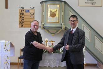 Michael Hirschelmann übergibt die Osterkerze für Krickenbach an Pfarer Wolfgang Hust