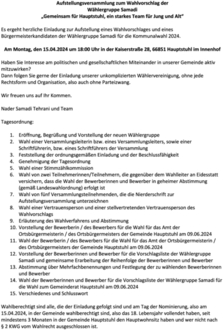 Es ergeht herzliche Einladung zur Aufstellung eines Wahlvorschlages und eines Bürgermeisterkandidaten der Wählergruppe Samadi für die Kommunalwahl 2024.