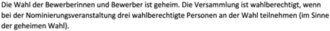 Die Wahl der Bewerberinnen und Bewerber ist geheim. Die Versammlung ist wahlberechtigt, wenn bei der Nominierungsveranstaltung drei wahlberechtigte Personen an der Wahl teilnehmen (im Sinne der geheimen Wahl).