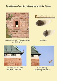 Jetzt ist Daumendrücken angesagt. In diesen Tagen wurden mehrfach Turmfalken am Schopper Kirchturm gesichtet. Im März wurden an den Fensterhöhlen im Turm der Protestantischen Kirche Nisthilfen in Form von Brettern zum Nestbau angebracht. Außerdem konnten wir die typischen Turmfalken-Gewölle unterhalb des Langschiffs entdecken. Mit viel Glück werden die Greifvögel am Kirchturm heimisch und ziehen bei uns ihren „Schopper Nachwuchs“ groß.