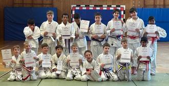 Vor den Augen des Prüfers zeigten die Judoka ihr erlerntes Programm der Fallschule, Stand- und Bodenprogramm und konnten am Ende stolz ihren nächstfarbigen Gürtel in Empfang nehmen.