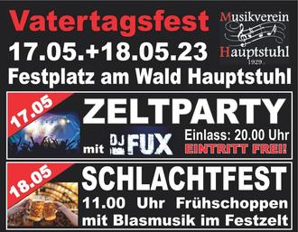 Wie gewohnt, finden die Veranstaltungen zum Vatertag im Festzelt auf dem Festplatz am Wald in Hauptstuhl statt.
