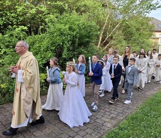 Am Ende der Mahlfeier sprachen die Messdiener, die Katechetin Ute Garth, der Vorsitzende des Gemeindeausschusses, Elias Traub, und auch Ortsbürgermeister Michael Klingel, Grußworte und überreichten kleine Geschenke. Mit einem feierlichen „Großer Gott, wir loben dich“ endete diese überaus ergreifende Kommunionfeier, die den Kindern ein Leben lang in Erinnerung bleiben wird.