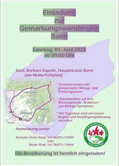 Seit vielen Jahren wurde der Wunsch nach einer Bännjer Gemarkungswanderung bekundet – nun ist es endlich soweit. Die Naturfreunde Bann haben dieses Streben aus der Bevölkerung aufgegriffen und für Sonntag, 01.06.2025 einen finalen Ablaufplan organisiert. Bei dieser ausgiebigen Tagestour über eine Strecke von ca. 15 Kilometern wird auch informativ viel über die jahrtausendealte Historie gerade im östlichen Gemarkungsgebiet um den Perlenberg sowie am Alten Zoll oder Torhaus zu erfahren sein. Bereits in vorchristlicher keltisch-römischer Zeit zogen sich Handelswege genau dort vom Bliesgau über die Sickingerhöhe kommend nach Kaiserslautern und weiter zum alten Rheinhafen nach Worms entlang. Geschichtliche Vorträge wird es unter anderem auch am Quellbereich des Hoheneckerbaches oder der alten Bännjer Waldsiedlung Walkmühle geben. Bei der großen Mittagsrast am Fuße der kleinen Bännjer Burgruine „Perlenberg/Perlenburg“ steht auch ein kulinarisch wie auch getränketechnisch gut gerüstetes Begleitfahrzeug direkt vor Ort. Zur besseren Vorplanung und Organisation wäre eine vorherige Anmeldung für die Naturfreunde von großem Vorteil. Festes Schuhwerk sowie dem Wetter entsprechende Kleidung wird empfohlen.