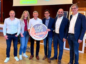 Unter den Klängen des Böhmischen Traums „Der Hellste Stern“ wurde Ralf Leßmeister, CDU, nach seiner Wiederwahl als Landrat im Bürgersaal Hütschenhausen von einer rhythmisch klatschenden Menschenmenge freudig empfangen. Das Bännjer Duo „Sax’n Drums“ heizte dabei musikalisch ein. Leßmeister dankte allen Helferinnen und Helfern, die ihn während des Wahlkampfes begleitet und unterstützt hatten. 68,6 Prozent der Stimmen erhielt der alte und neue Landrat nach vorläufigem amtlichen Endergebnis. Auf seinen SPD-Herausforderer entfielen 31,4 % der Stimmen. Für die kulinarische Versorgung war am Sonntagabend gesorgt. Unter den jubelnden Gästen waren auch zahlreiche Parteifreunde aus Landstuhl, darunter der Beigeordnete Gerhard Malinowski, die Beigeordnete der VG Elke Dick, Gemeindeverbandsvorsitzender Christopher Bretscher, Stadtbürgermeister Mattia De Fazio und 1. Stadtbeigeordneter Boris Bohr