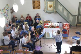 Der Posaunenchor Trippstadt im Gottesdienst an Pfingstmontag in der Protestantischen Kirche Linden