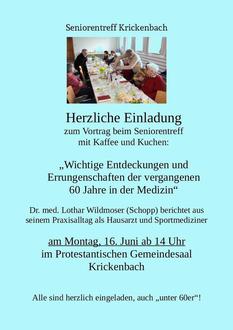 Wir laden herzlich ein zu unserem nächsten Seniorentreff in Krickenbach am Montag, 16. Juni ab 14:00 Uhr im Protestantischen Gemeindesaal Krickenbach.