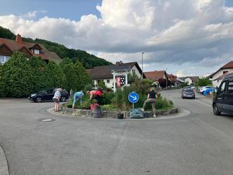 Pünktlich zum Besuch einer Delegation aus der französischen Partnergemeinde Migné-Auxances sowie des Radrennens des RV 1906 Bann über die Pfingstfeiertage haben freiwillige Helfer*innen vom Landfrauenverein Bann, der Freien Wählergruppe (FWG) Bann und Nachbarsfamilien unter der fachkundigen Aufsicht der Gemeinde-Blumenfrau Maria Vater die komplette Pflanzfläche des Kreisels im Wohngebiet Kahlenberg von jeglichem Unkrautverwuchs befreit und somit in einen sehr gepflegten und ansehnlichen Zustand versetzt. Als Belohnung und kleines Dankeschön gab’s nach getaner Arbeit vom Bürgermeister Michael Klingel für alle noch ein,,Likörchen“. Zu einem späteren Zeitpunkt sollen von genau dieser Besetzung die freien unbepflanzten Flächen noch mit Vliesstoff und Rindenmulch gegen zukünftigen wilden Verwuchs bedeckt werden. Wieder einmal eine tolle Aktion in starker Teamarbeit und Gruppendynamik, welche dem,,Gemeindesäckel“ eine riesen Summe Geld erspart. Die Gemeinde Bann sagt Danke – schön, dass es Euch gibt!