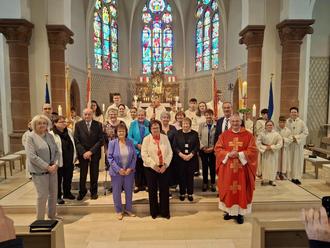 Am Pfingstsonntag fand ein außergewöhnlicher Pfingstgottesdienst in der neugotischen Valentinuskirche in Bann statt. Das feierliche Hochamt stand im Zeichen zweier Ereignisse in der Gemeinde: zum Einen war im Rahmen der deutsch-französischen Partnerschaft eine 30-köpfige Delegation in Bann zu Gast und zum Anderen feierten mehrere Kommunionjubilare ihr 40., 50., 65., 70. und 80. Kommunionjubiläum. Dementsprechend war diese Messfeier ein besonderer Höhepunkt in der Bännjer Pfarrgemeinde. Rund 20 Messdiener zogen zusammen mit Pfarrer U. Stenz mit Orgelspiel, Fahnen, Kerzen und Kreuz durch das Mittelschiff in das geschmückte Gotteshaus ein und umrahmten den Altarraum. Pfarrer Stenz begrüßte recht herzlich die französischen Gäste und die Jubilare auf Deutsch und Französisch. Auch Teile der Festpredigt und des Evangeliums sprach der Pfarrer in gutem Französisch. In seiner Predigt hob er besonders die Würde des Menschen hervor, ohne die kein christliches Miteinander möglich ist. Gerade Pfingsten, so der Pfarrer, ist das Symbol der Völkerverständigung, wie sie die Gemeinde Bann und Migné-Auxances jetzt schon 37 Jahre Freundschaft zelebrieren. Bei der Kommunionfeier durften sich die Jubilare um den Altar aufstellen und empfingen die Hostie und den Weinkelch als Leib und Blut Christi. Zum Ende der Eucharistie-Feier erhielt jeder der Kommunionjubilare eine Urkunde mit der Jahreszahl. Alle Anwesenden erlebten einen ergreifenden Gottesdienst, der bei den Franzosen und Deutschen noch lange nachwirken wird. (ge)