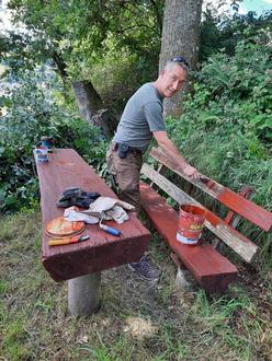 In Bann an der Ziegelsteige hinauf zum Kahlenberg sprudelt unter einer alten Baumwurzel heraus schon seit Jahrhunderten die Steinalbquelle, die aber schon nach wenigen Metern kanalisiert durch das Dorf geführt wird und erst wieder im Bruch zum Vorschein tritt und ins Bachbett mündet. Vor rund 25 Jahren hat die damalige CDU-Fraktion direkt neben der Quelle eine Sitzbank mit Tisch installiert und einen Hinweisstein einbetoniert. Jedoch im Laufe der Zeit war die Quelle und die Bankgarnitur fast zugewachsen und kaum noch sichtbar. Diesen Missstand hat jetzt der CDU-Ortsverband Bann in einem Arbeitseinsatz behoben und den schönen Platz saniert.Die Steinalbquelle wurde wieder frei geschnitten und von Unrat gesäubert, sowie die Bank mit Tisch abgeschliffen und neu gestrichen. Durch die anhaltende Trockenheit kommt leider nur sehr wenig Wasser aus dem Quellenloch. Trotzdem lädt der schattige Platz jetzt wieder zum Sitzen und Ausruhen ein und bietet einen schönen Blick auf den Kahlenberg und das darunter liegende Baugebiet. Unsere Aufnahme zeigt den CDU-Vorsitzenden Jan Schneider beim Streichen der gesäuberten Bank. (ge)
