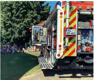 Die Augen wurden aber schnell größer, als dann mit Blaulicht und Martinshorn die örtliche freiwillige Feuerwehr an die KiTa fuhr. Alle blieben wie Mäuschen still stehen. Als dann der Feuerwehrmann kam und nach der Vollständigkeit der Kinder fragte, löste er das Rätsel danach auf.