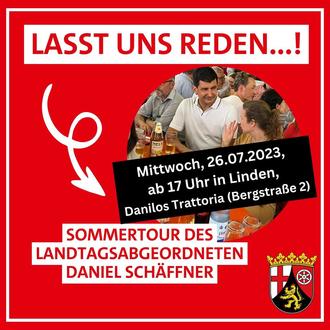 Mittwoch, den 26. Juli 2023 ab 17.00 Uhr in Danilos Trattoria (Bergstraße 2, 66851 Linden).