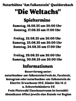 Die Naturbühne "Am Falkenstein" Queidersbach lädt zur Spielsaison 2025 ein. Nach der erfolgreichen Saison 2024, in welcher wir uns an Shakespeare wagten, geben wir nun ein weiteres Theaterstück unseres Lieblingsautors Paul Münch zum Besten: "Die Weltachs".